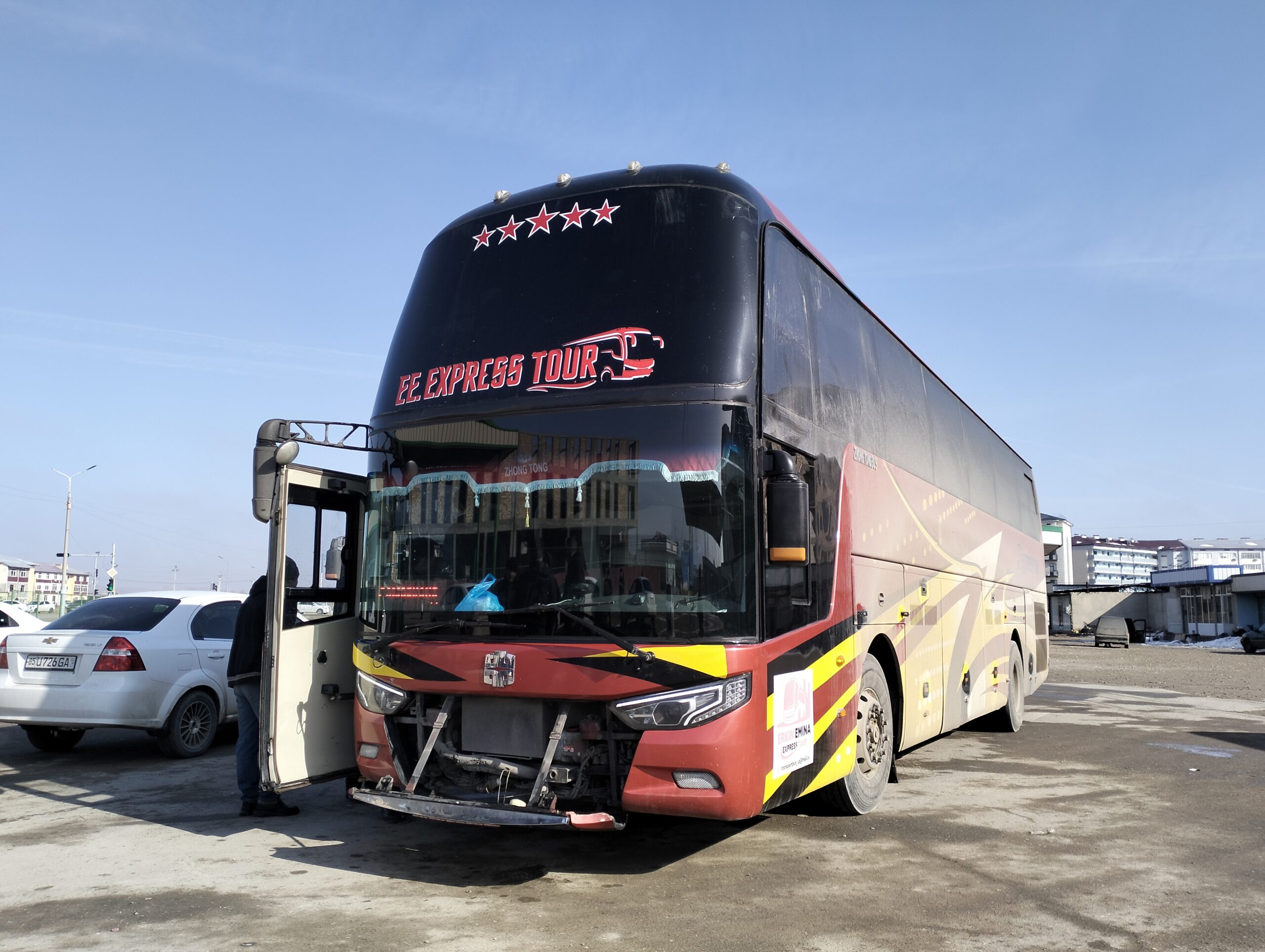 バス停でヒッチすれば、そのうち誰か止まると思う。親切な人が止まってくれた。筆者は降車時に20.000スム払った。